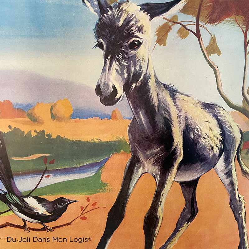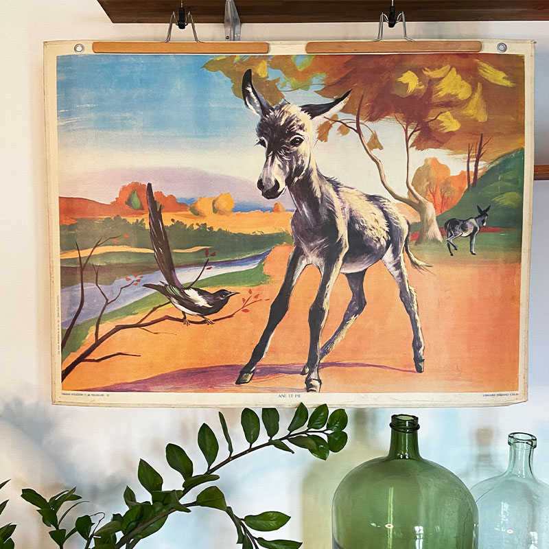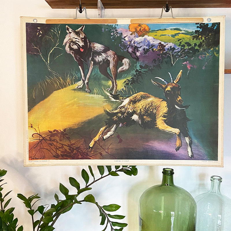 Grande et belle affiche d’école des années 60. Imprimée recto « Ane et pie » et verso « Chèvre et loup ».