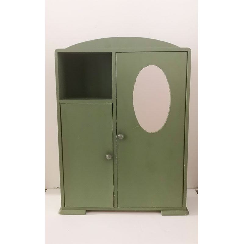 Armoire de poupée en bois avec 2 portes et un miroir.