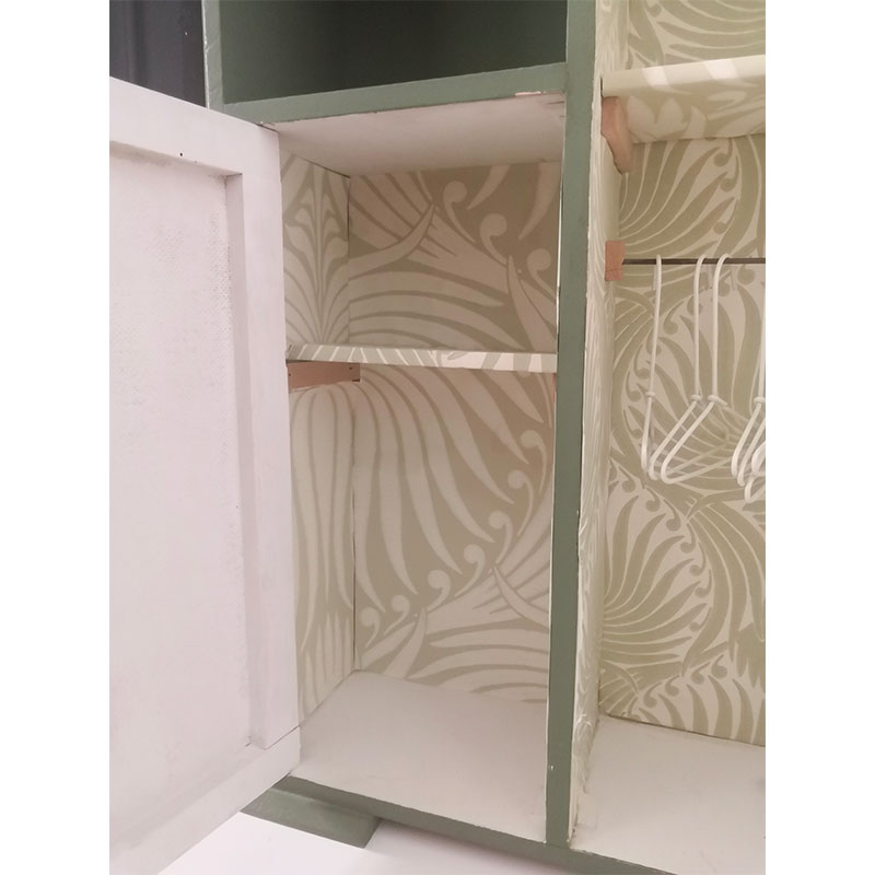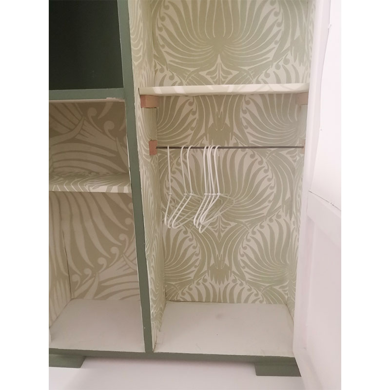 La couleur vert menthe est d’origine, j’ai repeint l’intérieur en blanc et tapissé le fond de papier peint Farrow & Ball assortie à la couleur de l’armoire.