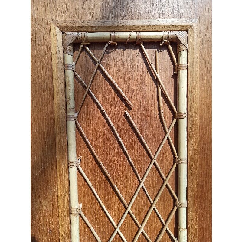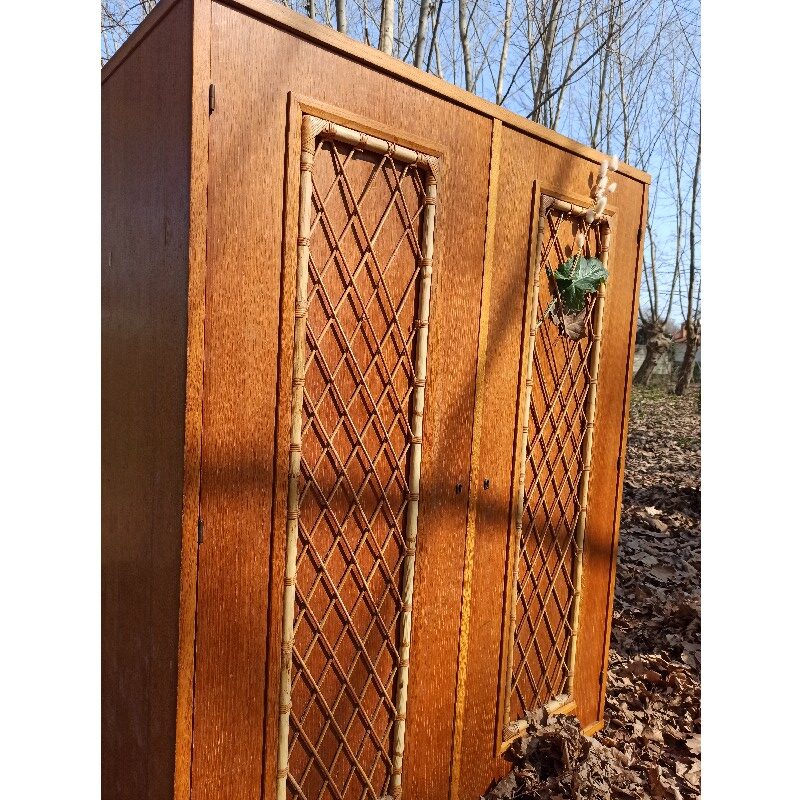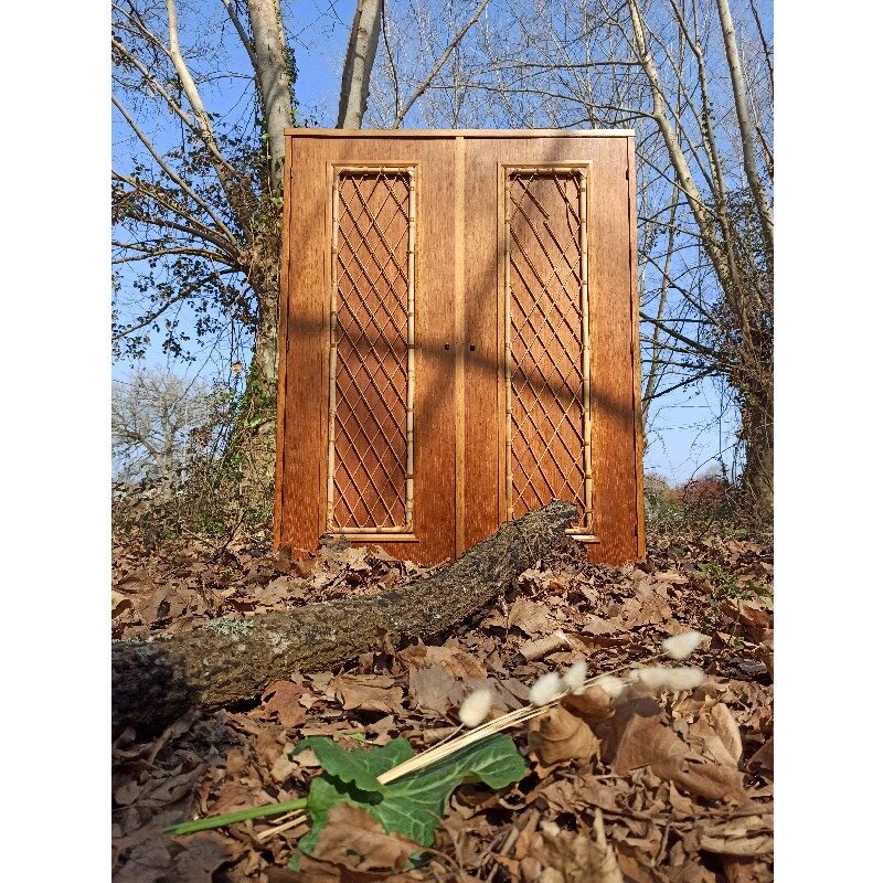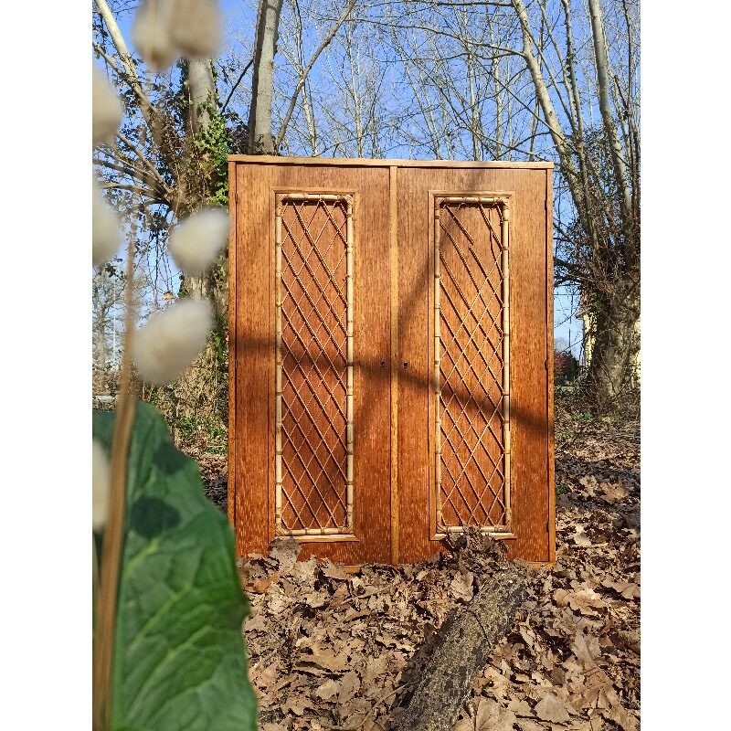 Jolie armoire vintage, datant des années 60, en bois et rotin. Celle-ci a gardée son côté « brut », qui lui donne tout son charme et sa singularité !