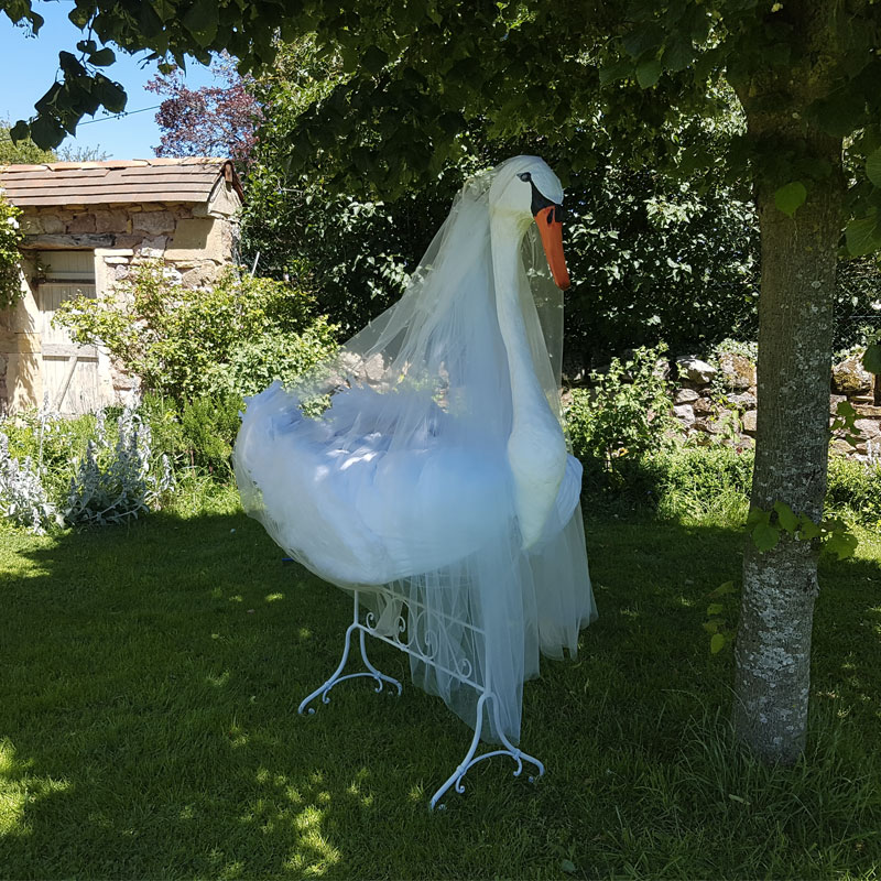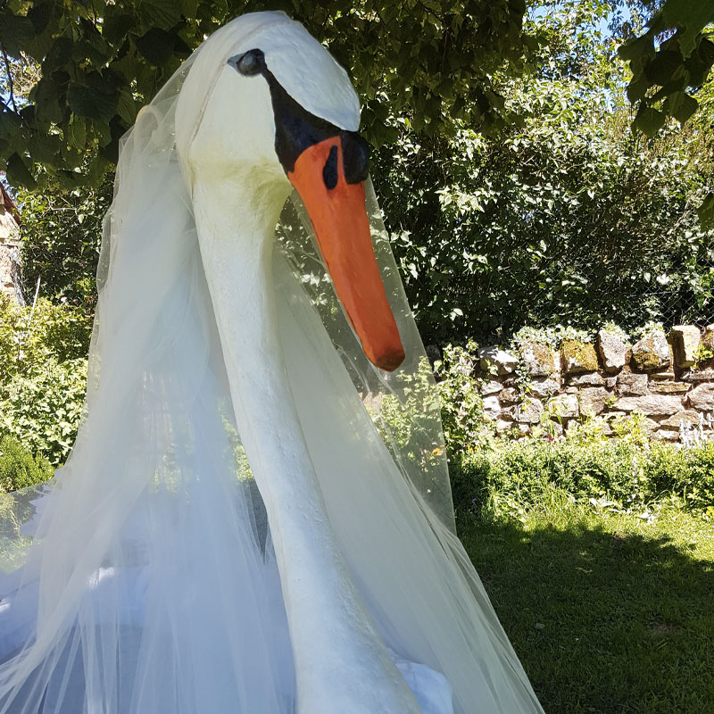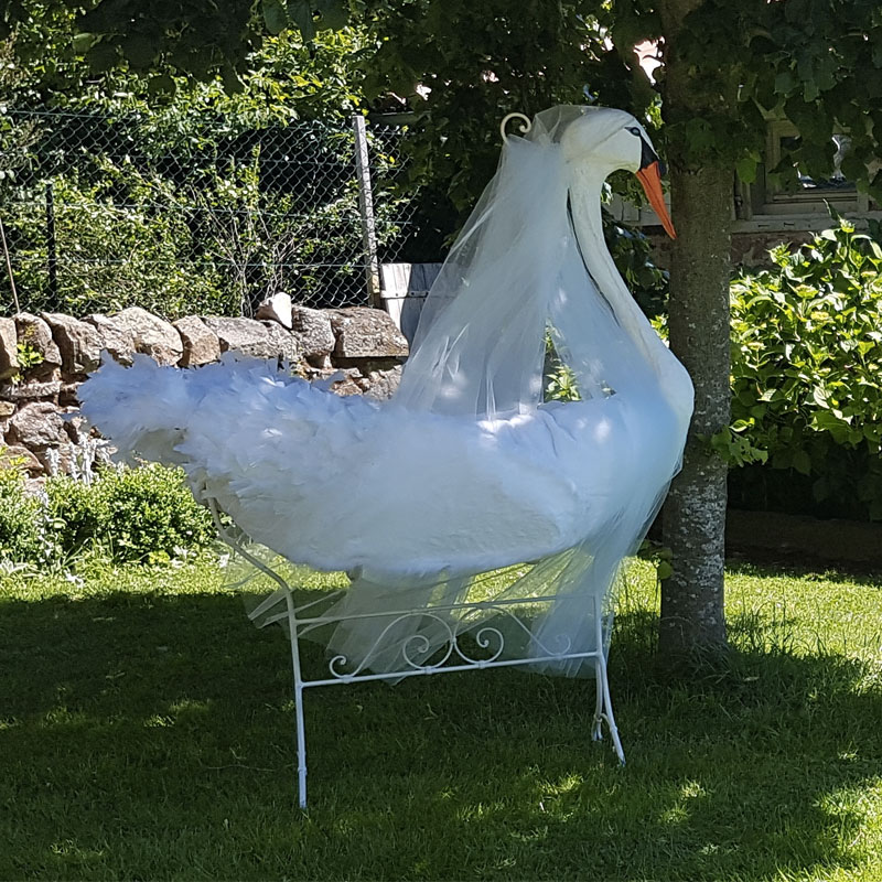 La tête et les ailes plumées sont réalisées en papier mâché. Le tour de couffin est cousu dans un duvet moelleux à souhait.