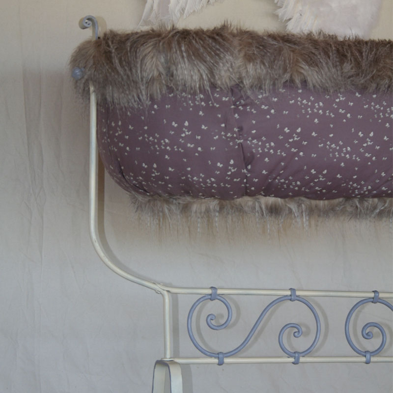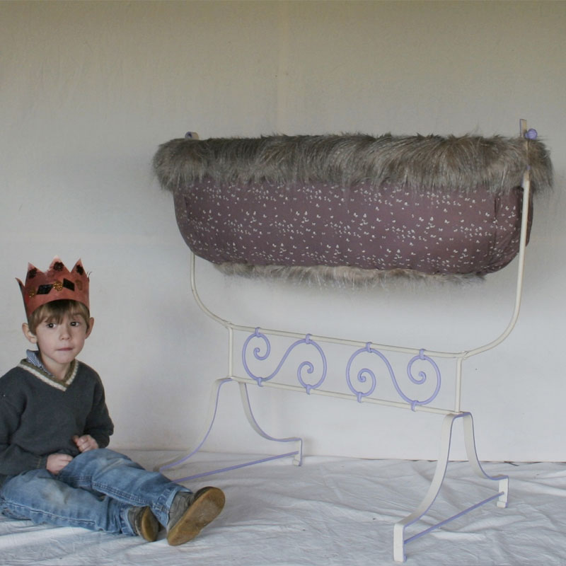 Pour entamer sa nouvelle vie, ce berceau en fer forgé s’est refait une petite beauté : sa patine dans les tons de lin et violette s’accorde à merveille avec le tissus « papilloné » qui le tapisse.
