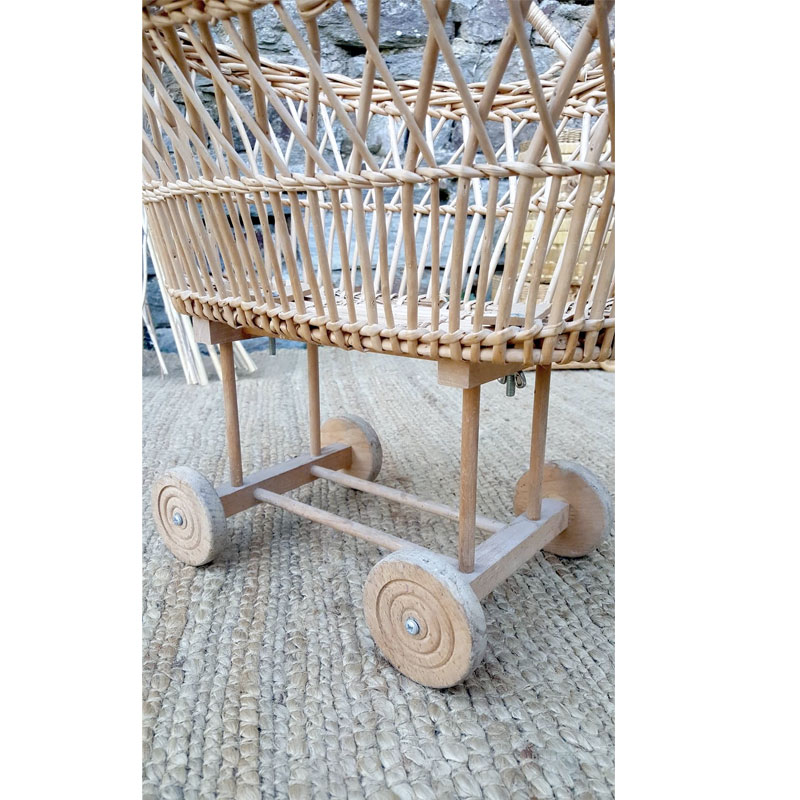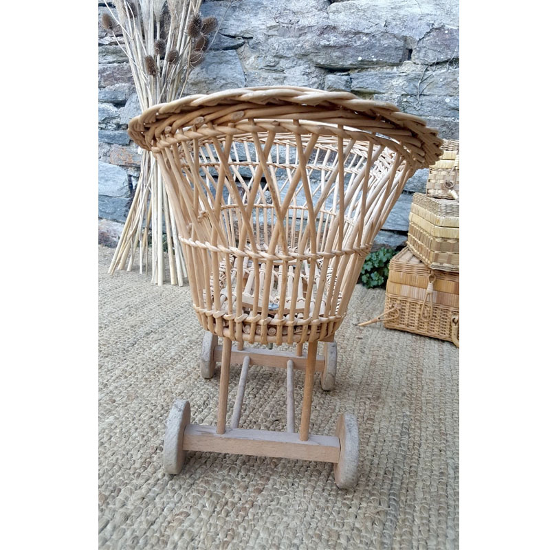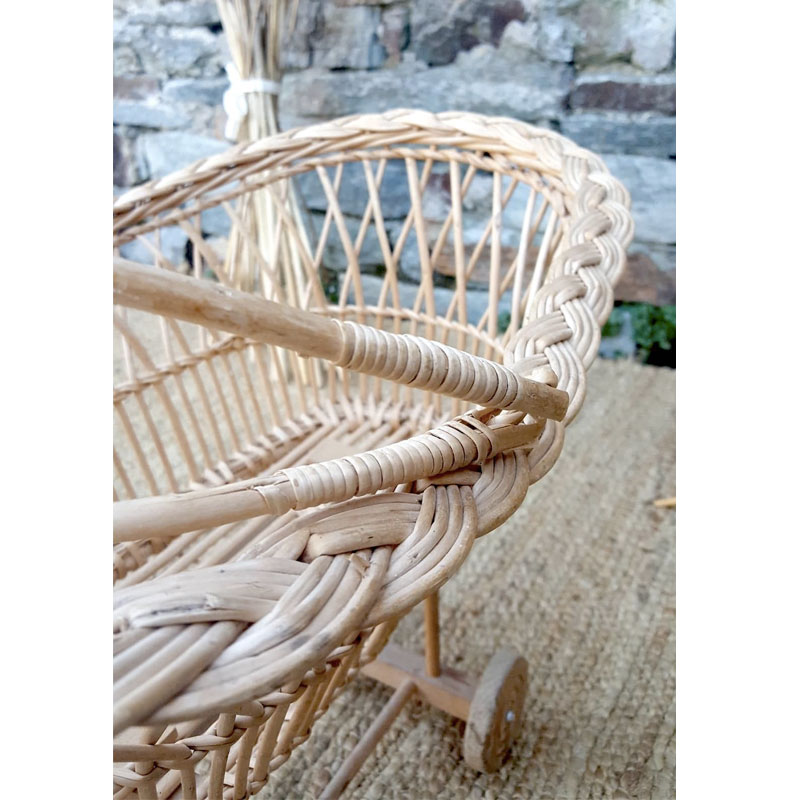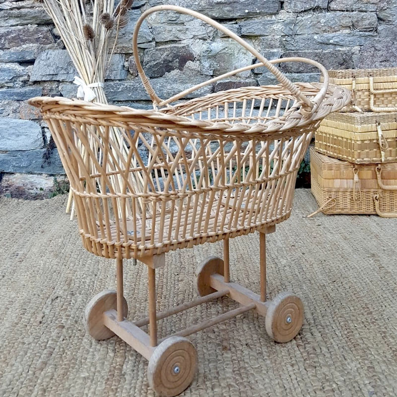 Berceau vintage en rotin pour poupée.
