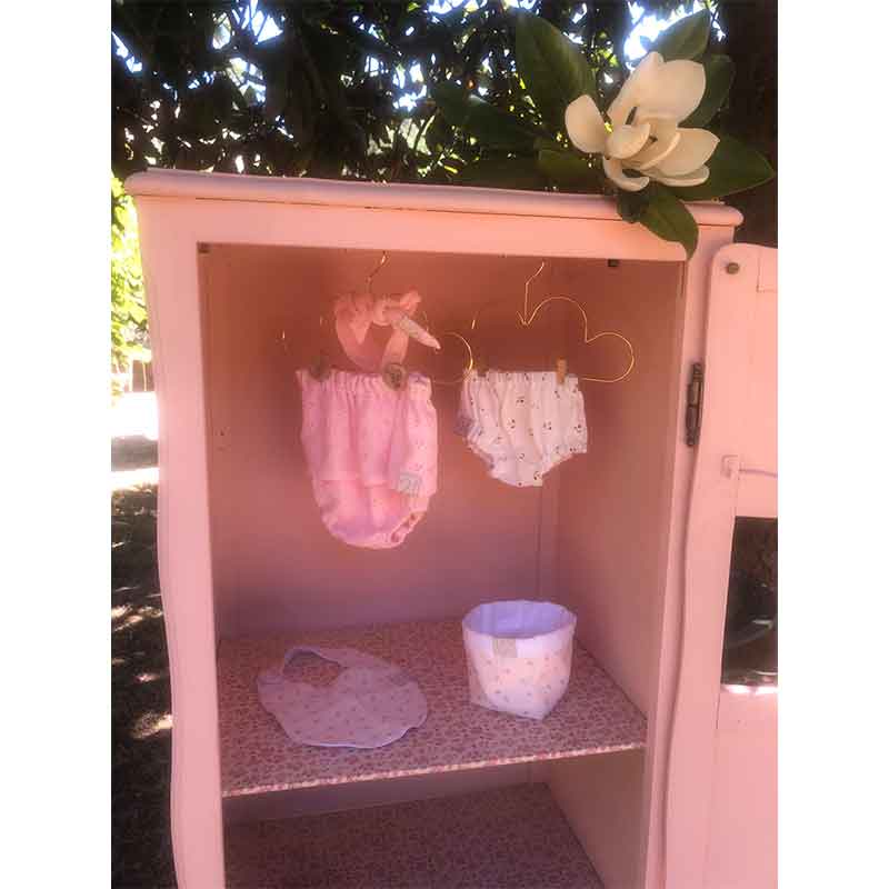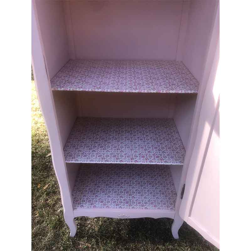 Elle est dotée de 3 étagères tapissées avec un papier peint « liberty » Cole and Son, d’une tringle en bois pour y suspendre les jolies robes 👗 de bébé 👶🏼 👧🏼, peinte dans le joli ton rose « Ruban » de la gamme « Liberon ». Un rideau peut facilement y être installé sur le devant de la porte, afin de cacher l’intérieur (attaches présentes).