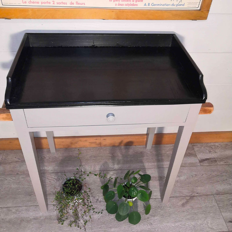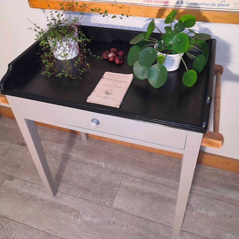 Cette table entièrement en pin date des années 1900, mais est encore utilisable en petit bureau même pour un adulte puisque la hauteur est de 75 cm.