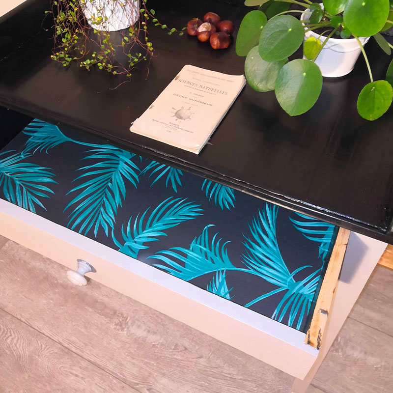 Deux tons (beige foncé et noir) pour l’extérieur, et un joli papier dans le tiroir pour la fantaisie. Certains petits défauts sont inhérents à la fabrication artisanale de ce meuble.