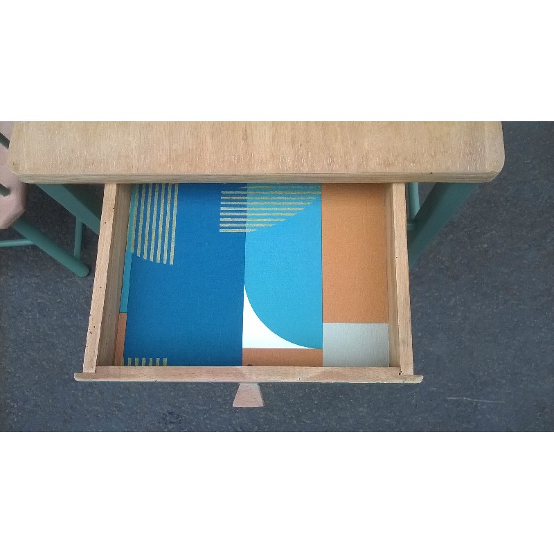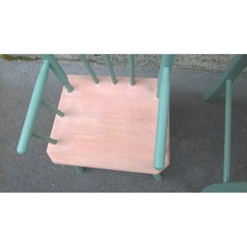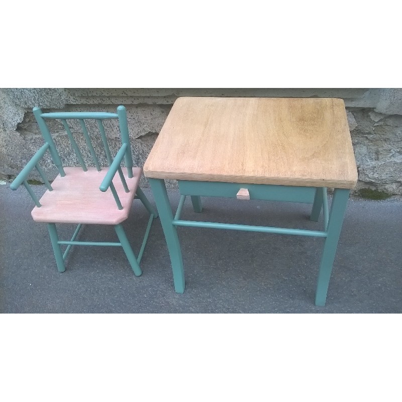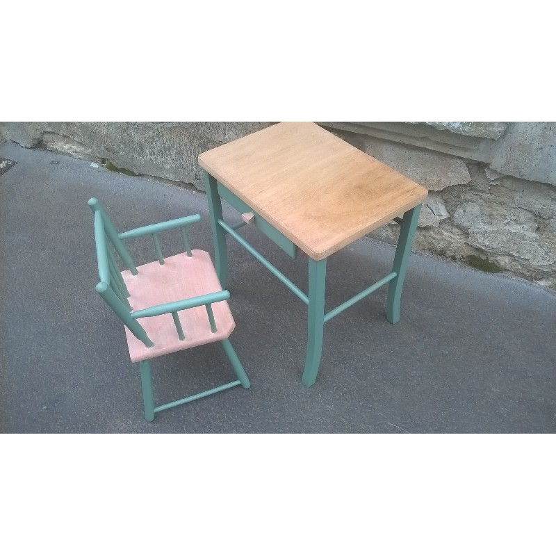 Ce bureau a été poncé et repeint en vert. Le plateau et l’assise ont été laissés brut (à noter : la chaise a une teinte un peu rose du a l’ancienne peinture).