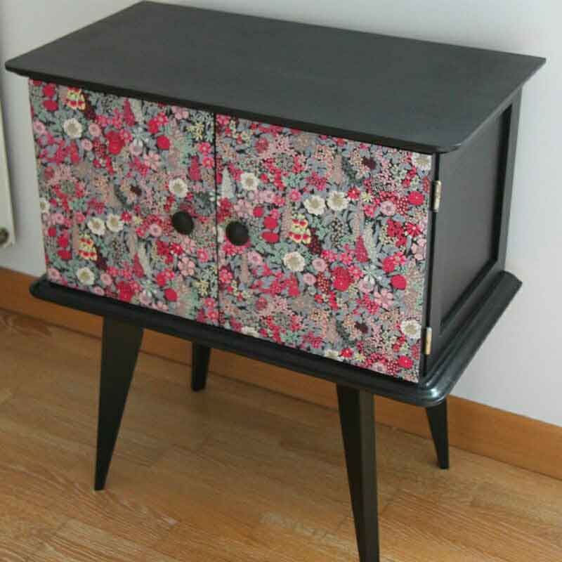 Joli chevet des années 50, pieds compas entièrement repeint en noir et portes recouvertes de tissu liberté. Intérieur bois avec un tiroir.