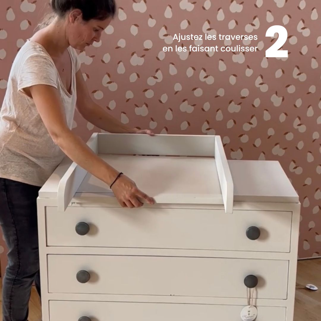 Vous pouvez donc installer la table à langer sur le plateau de la commode et choisir la position de celle ci grace à son système de serrage.
