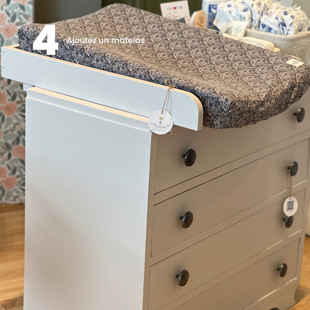 Vous vous demandez comment adapter à cette jolie commode un plan à langer, amovible, fiable et parfaitement coordonné ? Par ici La solution !