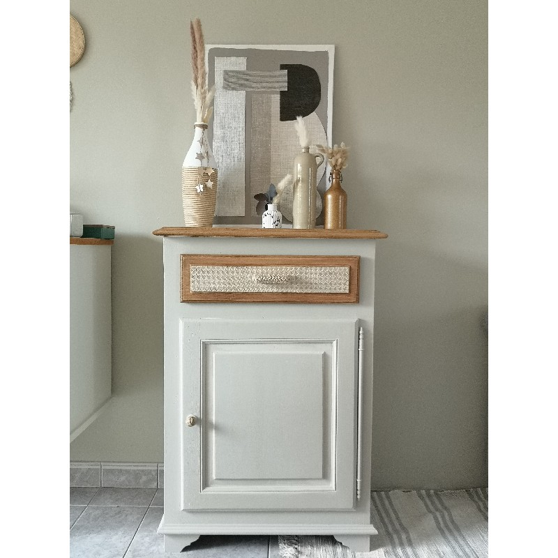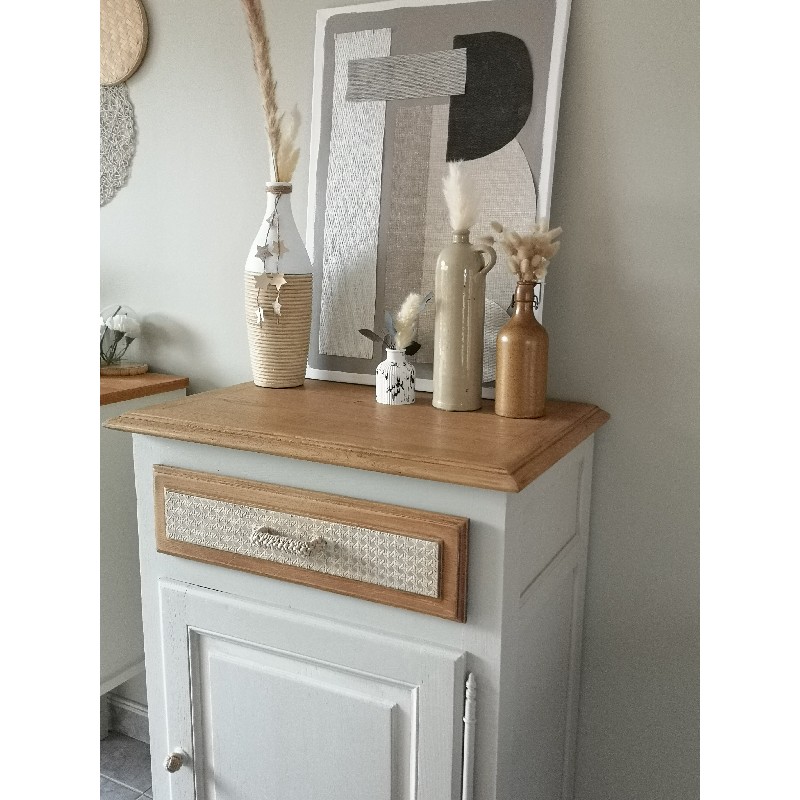 Le bâti a été peint en lin mat et le tiroir a été décoré avec le pochoir relief motif cannage de Eleonore Déco.