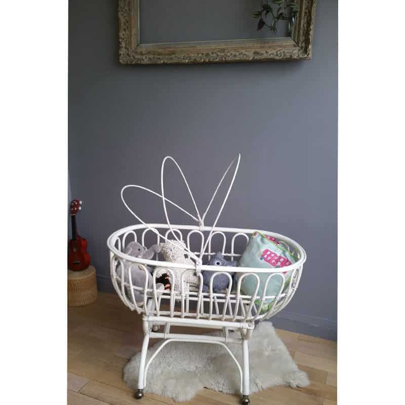 Couffin bébé en rotin blanc sur roulettes et support – Berceau vintage