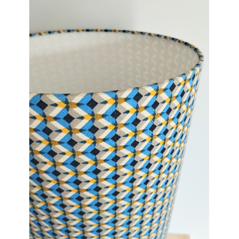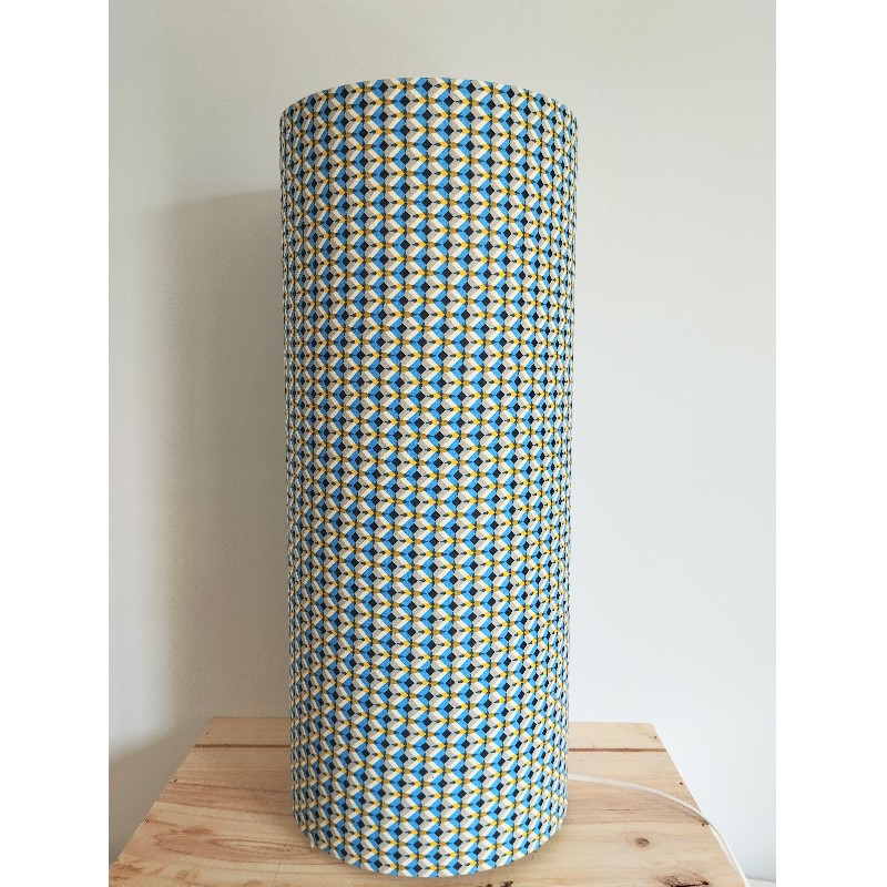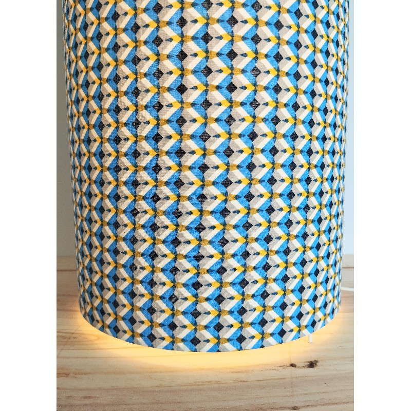 Lampe tube à poser bleu et jaune motifs géométriques