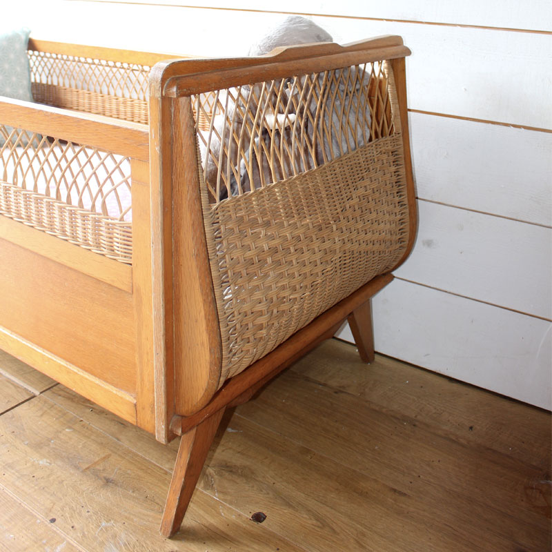 Lit de bébé années 60 en bois et osier.
