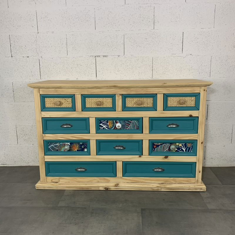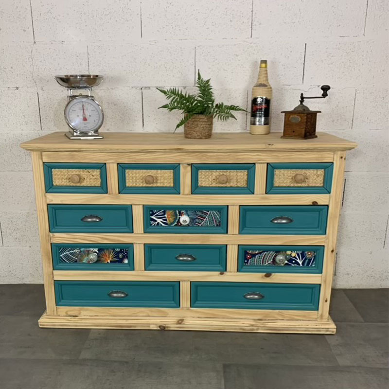 C’est un meuble très pratique car il comporte 12 tiroirs design, dans esprit rustique et industriel qui lui donne un cachet certain.