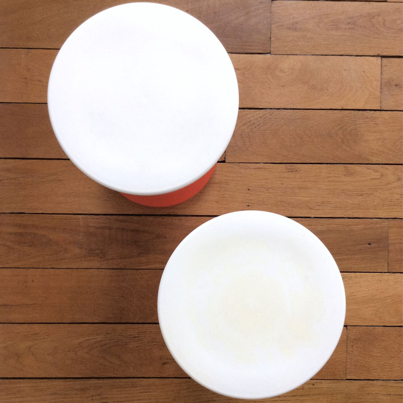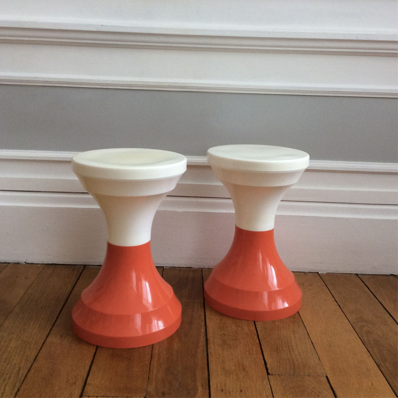 Originale et rare paire de mini tabourets plastique orange / blanc de taille enfant : un duo insolite !