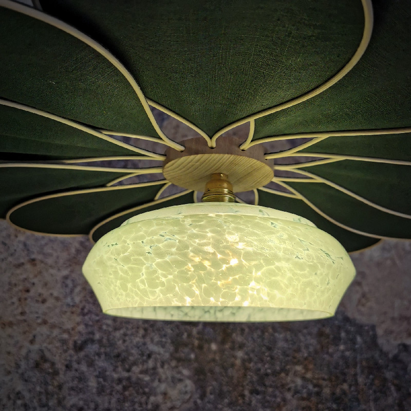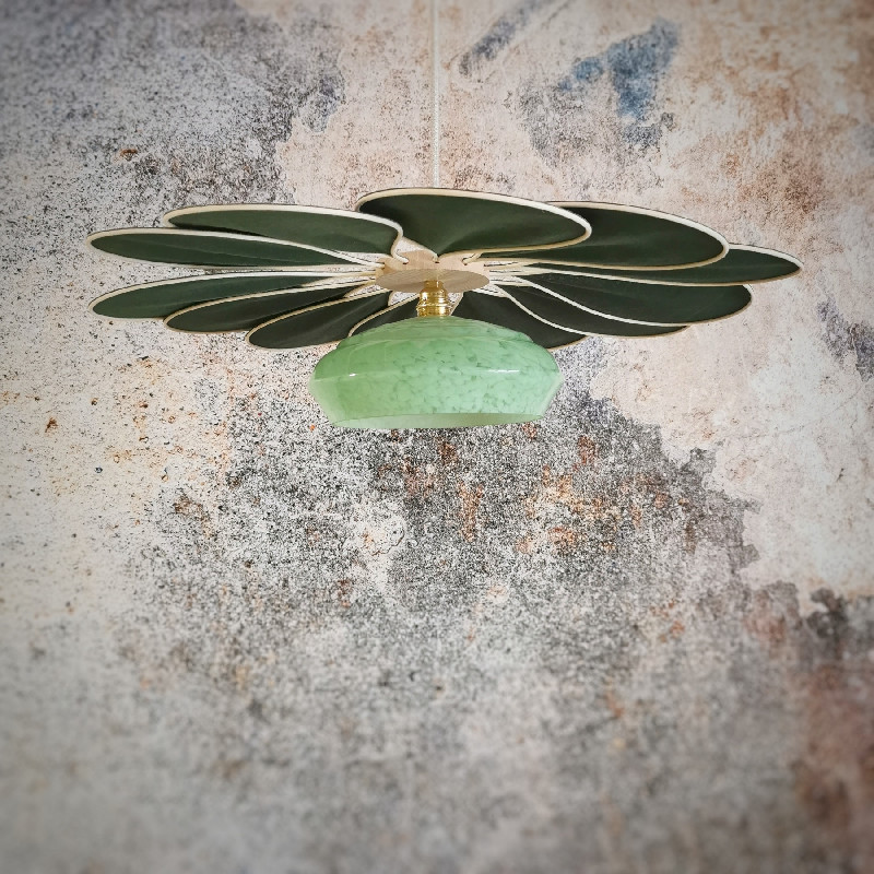 Suspension fleur 12 pétales en lin Vert Sapin et globe vintage – Lampes et veilleuses neuf – Capharnaüm