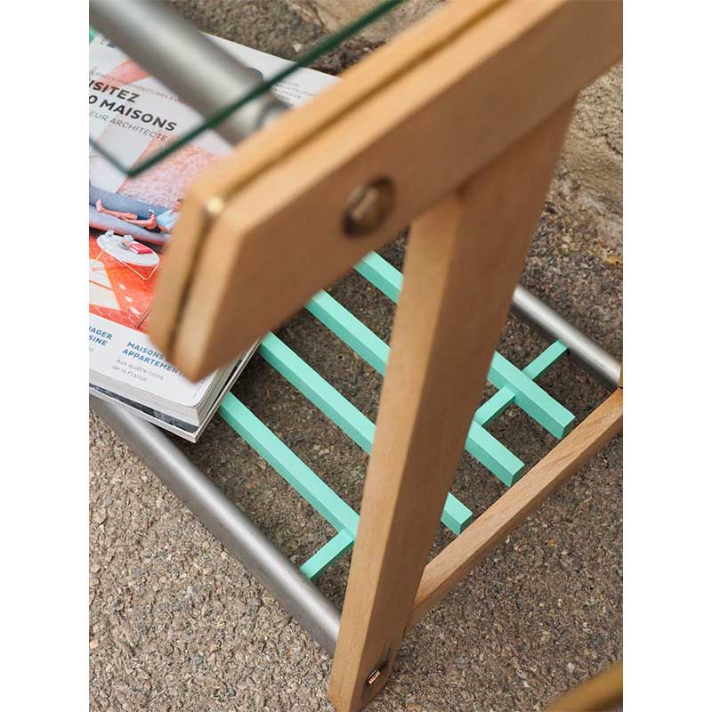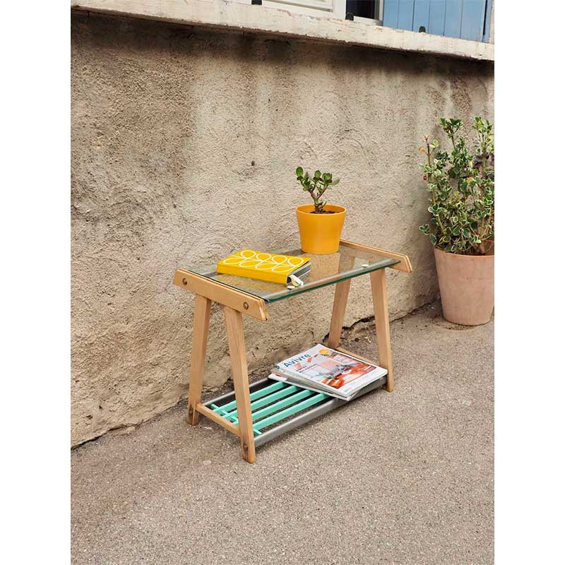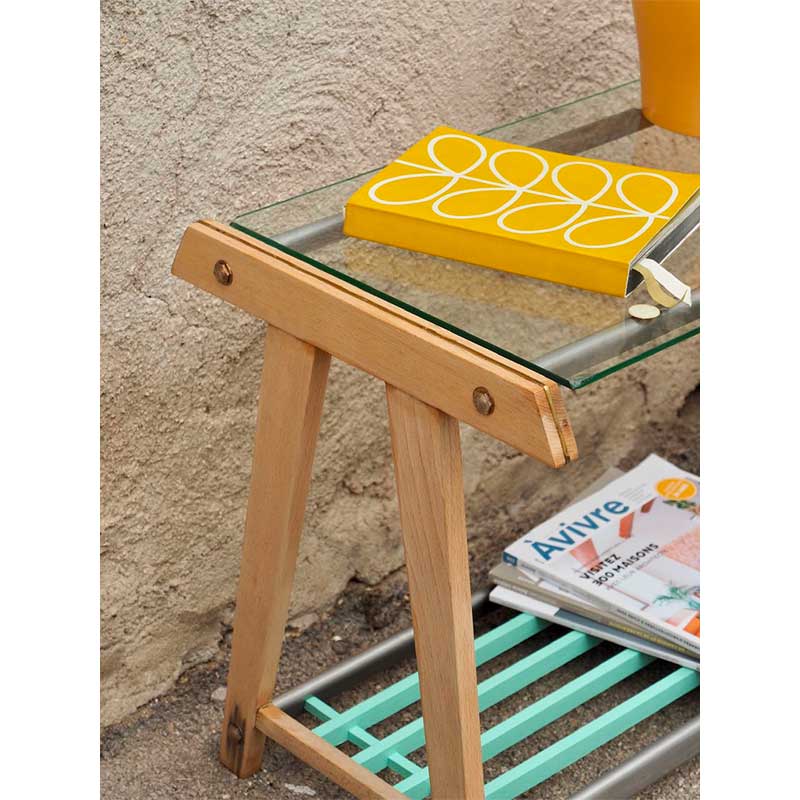 Petite table d’appoint ou bout de canapé vintage au bois blond relevé par une touche de turquoise sur l’étagère du bas.