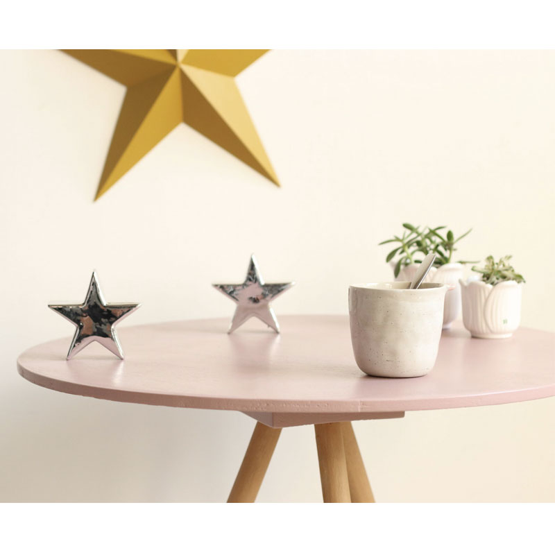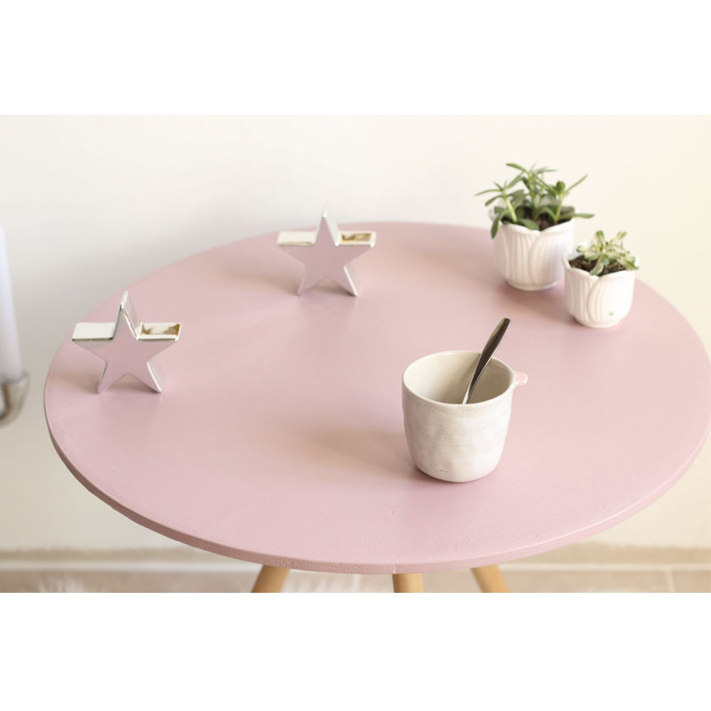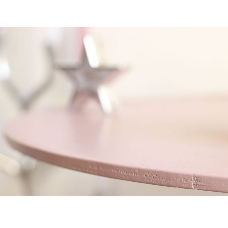 Son plateau en contreplaqué a été revisité dans une laque rose cendré à la finition veloutée.