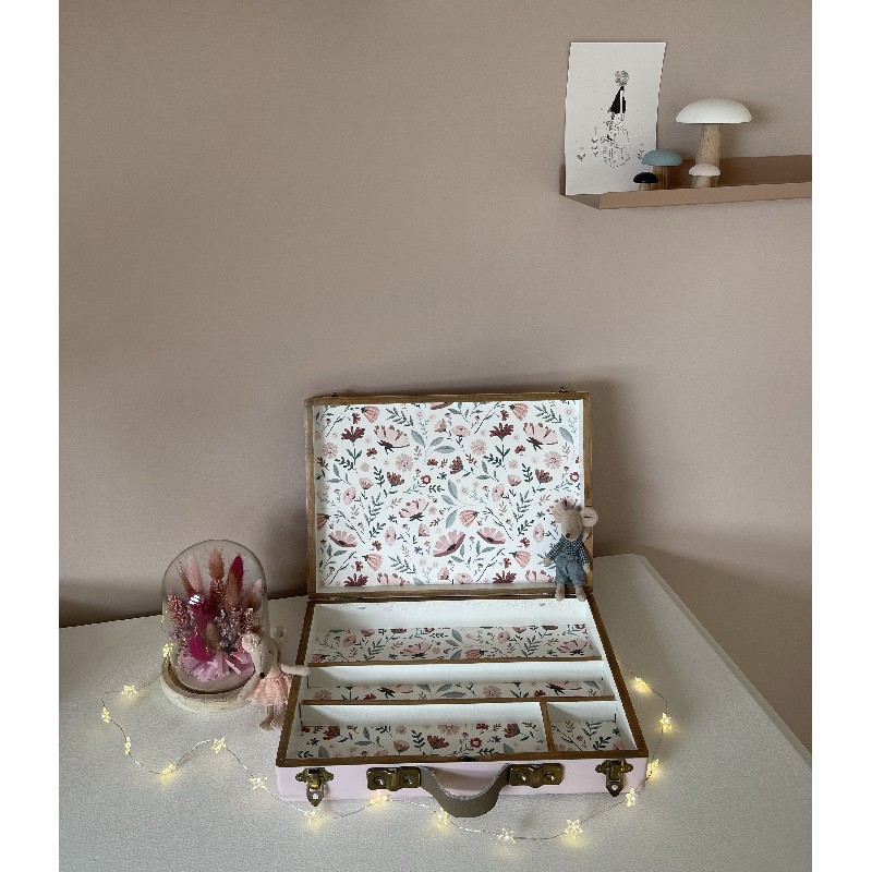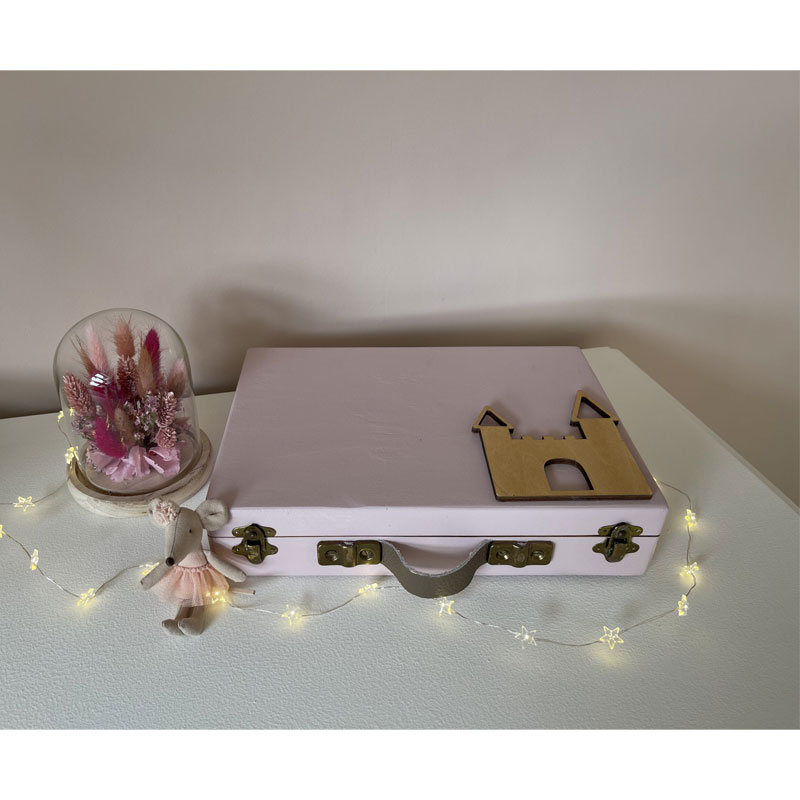 Un « rose ruban » apaisant de chez COLIBRI entoure la valisette protégé par du vernis pour permettre aux enfants de l’emmener partout sans risquer de l’abimer.