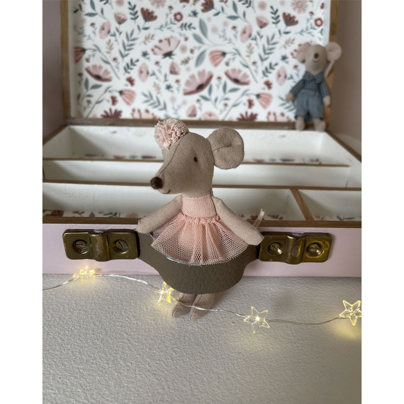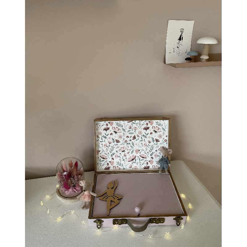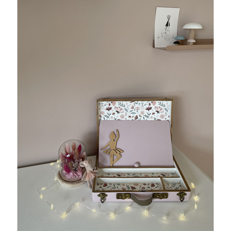 Une plaque décorée d’une ballerine en bois sert de couvercle intérieur. Elle permet de bloquer les objets lorsque la valisette est de sortie.