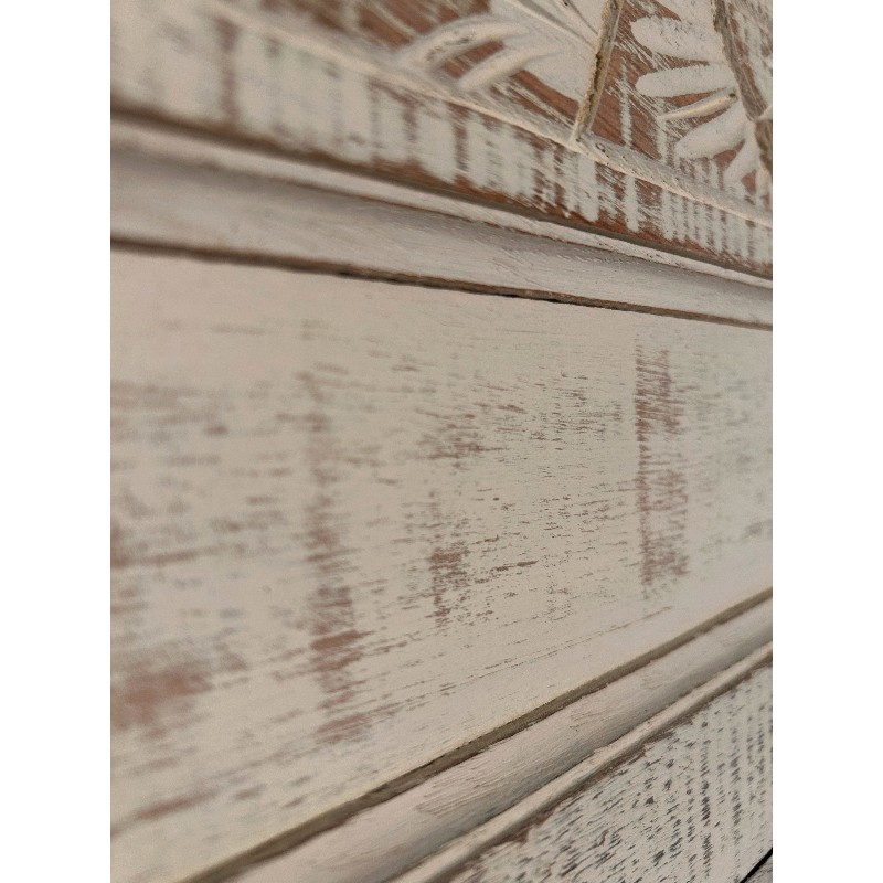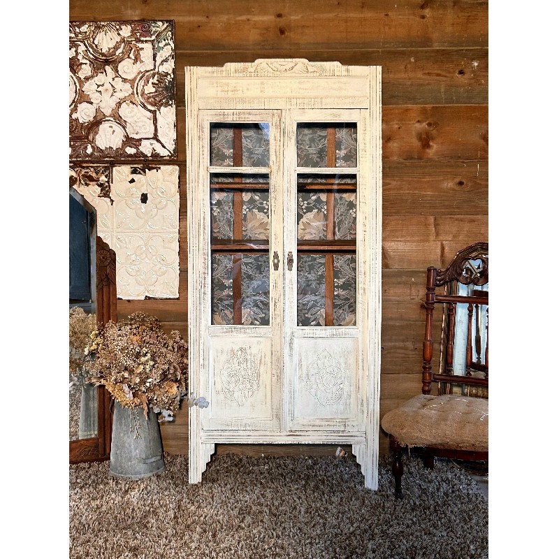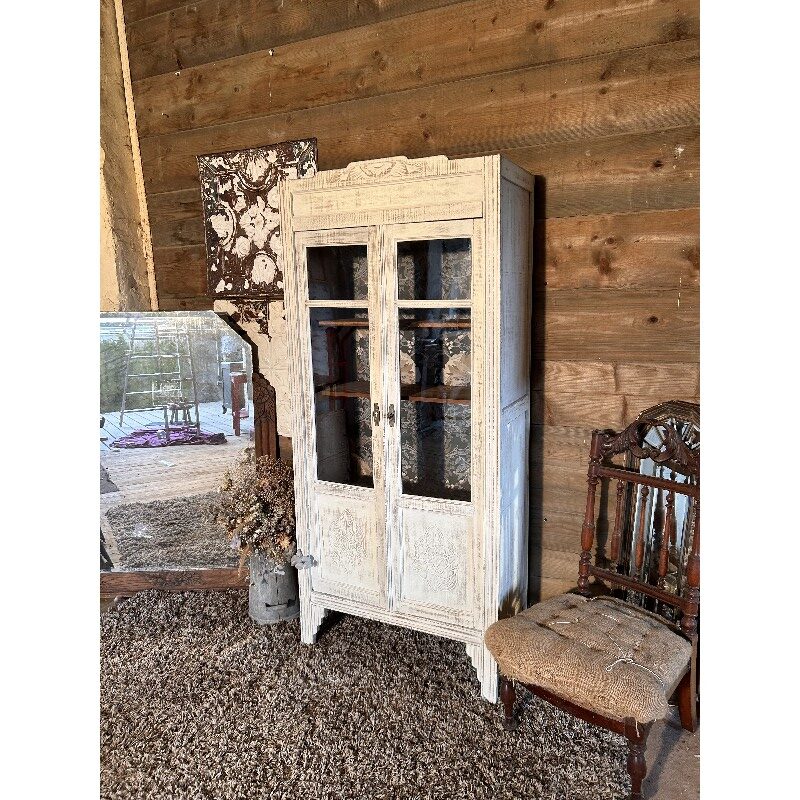 Cette jolie vitrine art déco a été entièrement aerogommée, poncée et ensuite patinée à l’ancienne avec une peinture faite maison avec des produits naturels ( haux, marbre, pigments naturels, caséine), la peinture a été entièrement protégée à la cire.